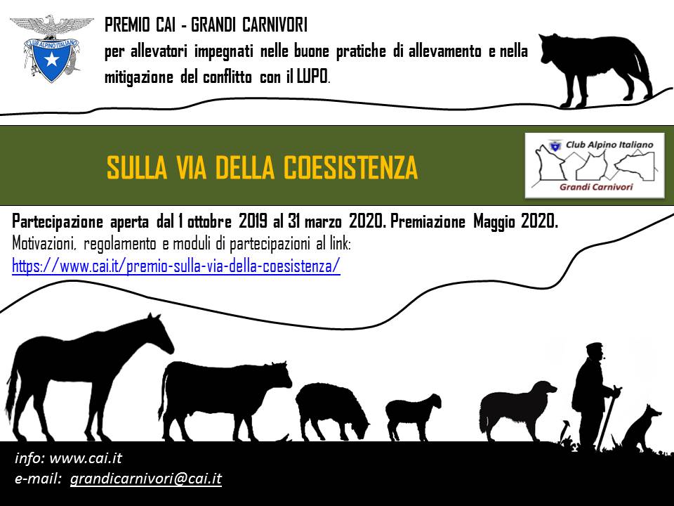 Il Gruppo grandi Carnivori del CAI indice il Premio “Sulla via della coesistenza” per dare un riconoscimento in denaro agli allevatori che mettono in atto buone pratiche di allevamento per mitigare il conflitto con il Lupo e cercare un percorso di coesistenza. si tratta di una piccola goccia nel mare, che vuole però essere un segnale di vicinanza e di sostegno del Club Alpino Italiano alla categoria più esposta agli effetti derivanti dalla presenza del lupo.