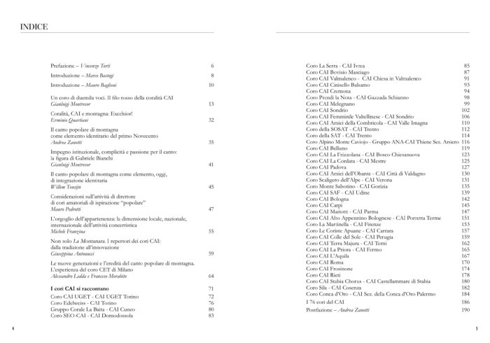 Tante storie. Tutte simili ma anche tutte diverse. 41 dei 76 cori del CAI raccontano il loro passato ed il loro presente. Gli esordi, le difficoltà, i successi, ma anche le disillusioni, le sconfitte e le ripartenze. Provenienti da ogni angolo d’Italia, anche il più inaspettato, narrano vicende che per alcuni risalgono a quasi cent’anni fa, per molti altri al primo periodo postbellico, per altri ancora una storia recente e ancora tutta da scrivere. Per tutti la scoperta o la riscoperta di un patrimonio artistico e culturale che non ha eguali al mondo: il mondo della montagna autentica attraverso il canto, con le sue vicende allegre e dolorose, raccolte da chi l’ha imparata dalla bocca dei nonni; ma anche l’incontro fecondo e straordinario della musica popolare con la musica colta, rielaborata e riproposta da musicisti illustri. Nomi di cori entrati nel mito della storia, altri invece alle prime armi. Repertori storici e nuove proposte, tradizione e innovazione, maestri mitici e giovani compositori. Nella prima parte del volume, alcuni dei migliori esperti, tutti del Consiglio del CNC e della Commissione Artistica, ci introducono nell’affascinante mondo del canto popolare di montagna. Nel nome di Gabriele Bianchi, maestro di vita e di valori.
