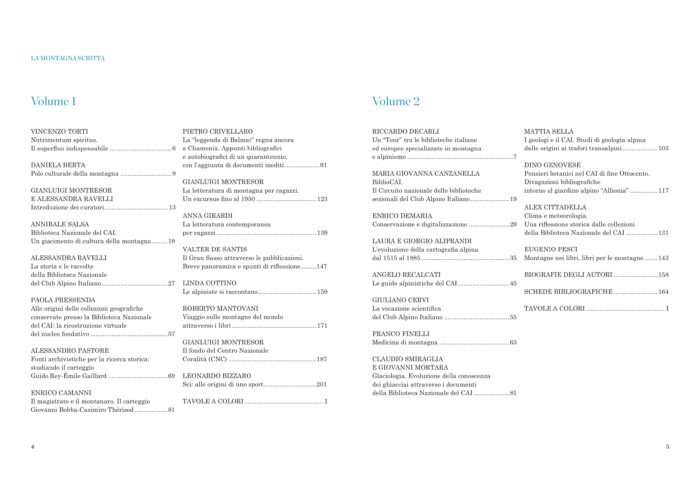 Opera essenziale per la diffusione del patrimonio culturale del Club Alpino Italiano, esce finalmente La montagna scritta. Viaggio alla scoperta della Biblioteca Nazionale del Club Alpino Italiano, in due volumi raccolti entro un elegante cofanetto. Frutto del lavoro complesso e appassionato dei curatori e di 27 collaboratori esperti, l’opera intende proporre a un pubblico di amanti della cultura della montagna un’ampia rassegna dello straordinario patrimonio librario che la Biblioteca ha raccolto nei suoi 160 anni di vita. I contributi degli esperti vanno a comporre un ricco mosaico di temi, spunti e riflessioni, realizzato attraverso il vaglio e l’analisi di decine di migliaia di volumi e riviste specializzate. La ricchezza di suggestioni che emerge da queste pagine, oltre a mettere in piena luce il ruolo storico e istituzionale svolto dalla Biblioteca, consentirà a ogni appassionato di conoscere la lunga e preziosa storia del libro di montagna, di comprendere le tappe fondamentali relative allo studio dell’ambiente montano, di scoprire vicende e personaggi sconosciuti e dimenticati, ma soprattutto di vivere emozioni che solo il racconto vivo e intenso della montagna sa suscitare.